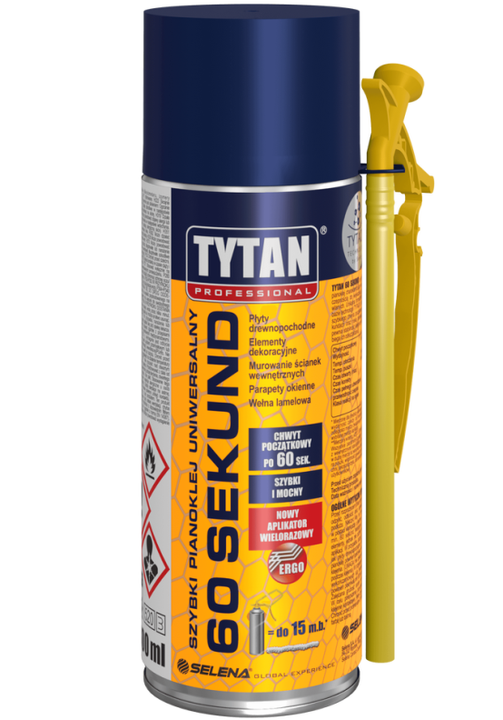 The application of the glue significantly speeds up the work: the initial grip is only 60 seconds and full curing is achieved after 24 hours. The 60 Seconds universal fast foam adhesive demonstrates excellent adhesion to typical construction materials such as: brick walls, hollow bricks, silicate blocks, Dry-walls, OSB boards, concrete, plaster, as well as wood, metals, polystyrene, hard PVC and rigid PUR foams".