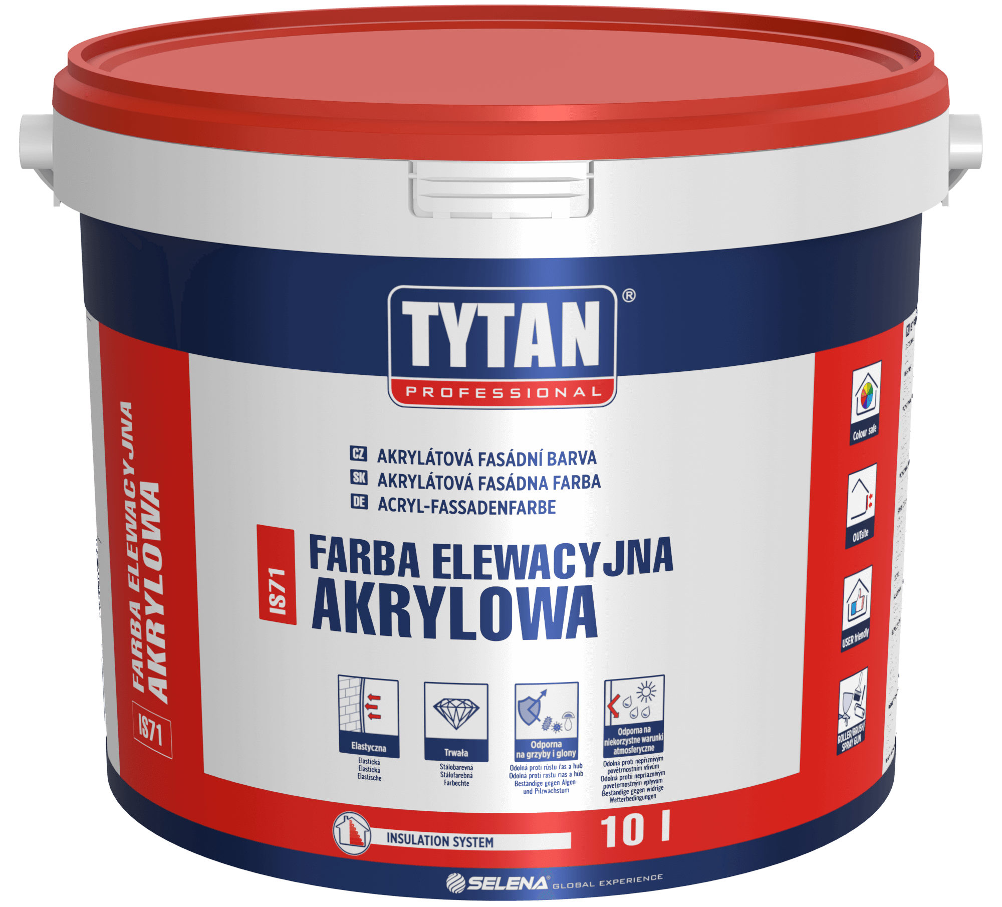 Facade acrylic paint is based on acrylic dispersion with the addition of high quality fillers and pigments. It features excellent covering-up properties, resistant to weather conditions such as: rain, UV radiation, frost and wind. Topcoat is matt, smooth, without cracks, resistance to cleaning and wet scrubbing. Can be applied manually and by spraying. The paint is available in a wide range of colours as listed in TYTAN PROFESSIONAL Colour Collection 300 and in other colours at customer’s request.