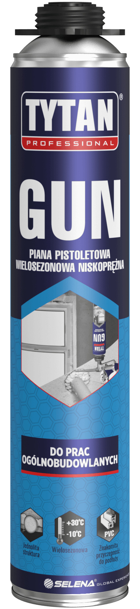 Tytan Professional GUN multi-season low-compression gun foam cures when exposed to moisture. It is dedicated to a wide range of applications – ideal for general construction work: mounting, sealing, filling, insulating. Once cured, the foam can be cut, sandblasted, plastered or painted. It is resistant to mold and mildew and to high and low temperatures (from -60°C to +100°C).