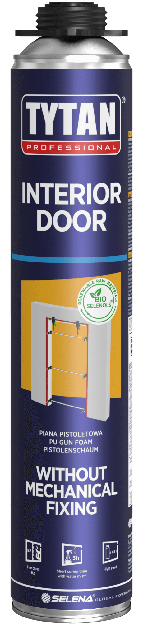 INTERIOR DOOR is a foam for mounting interior doors made of wooden and wood-based materials (MDF, chipboard) without the use of mechanical connectors (for door frames in mechanical strength class 1 and 2 according to EN 1192 and class N according to RAL RG 426). This foam is characterised by low, controllable post-expansion which ensures mounting without deformations of doorframes. The foam recipe is partly based on raw materials from renewable sources.