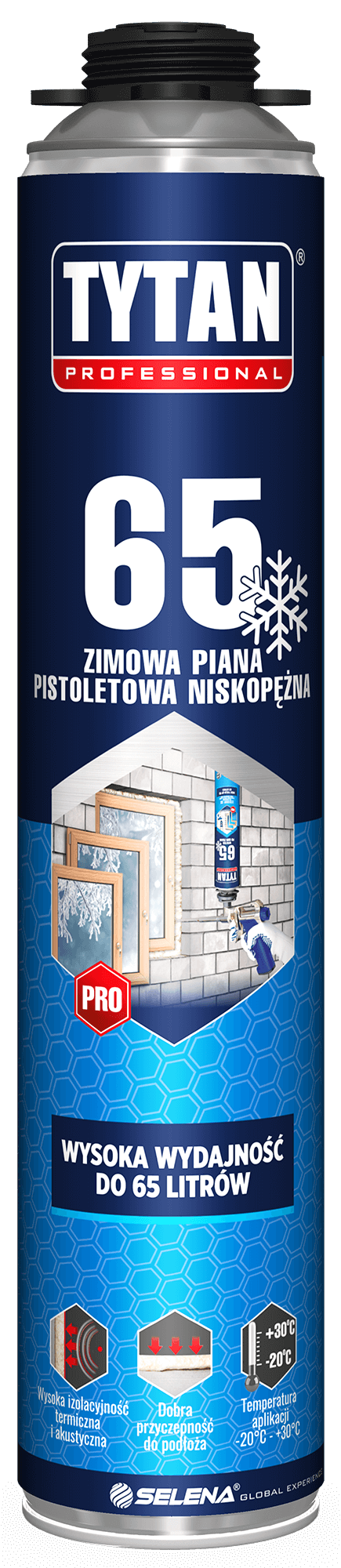 Tytan Professional 65 pistol foam in the winter formula allows working in a wide temperature range (from -20°C to +30°C). It is recommended for such construction applications as mounting, sealing, filling, insulating. Once cured, the foam can be cut, sandblasted, plastered or painted. It is resistant to moulds and fungi and to high and low temperatures.
