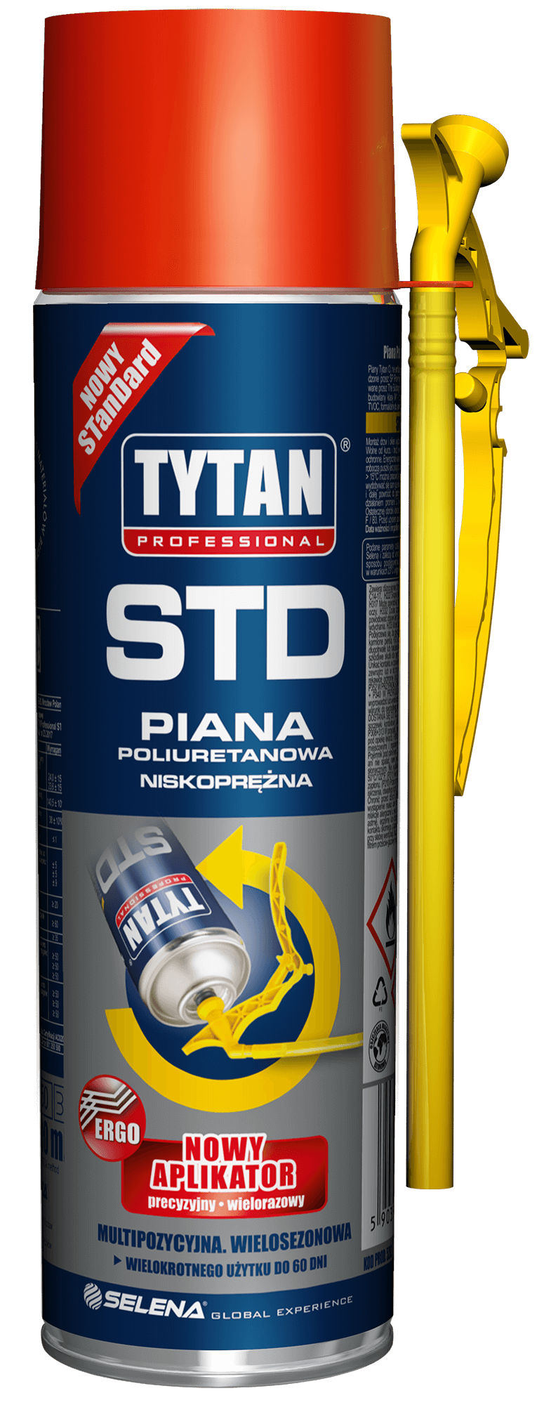 Tytan Professional STD assembly foam cures under the influence of moisture, recommended for a wide range of applications in the construction industry: assembly, sealing, filling, insulation. Thanks to the modern chemical formula, the foam does not flow from vertical surfaces, it is multi-positional – it can be released in the "valve up" position and multi-season – it can be used in both summer and winter. The foam is resistant to moulds and fungi and to high and low temperatures (-60ºC to +100ºC). The modern applicator added to it gives the possibility of reuse even up to 60 days after the first application and even greater comfort and convenience. It enables precise foam dosage even in hard to reach places. The foam can be held even with one hand while releasing it. The high quality Tytan Professional STD assembly foam with ERGO applicator is produced in accordance with ISO 9001:2000.