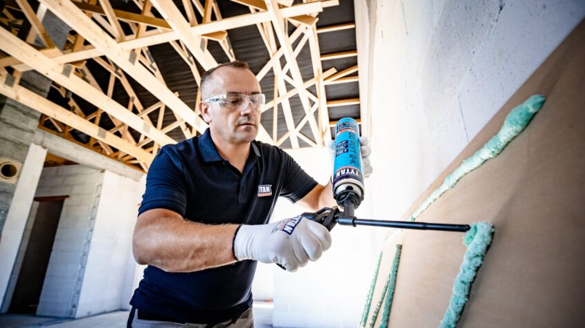 A professzionális ragasztóhab gipszkartonhoz gyors és hatékony tábla ragasztást kínál, tiszta és egyszerű módon.