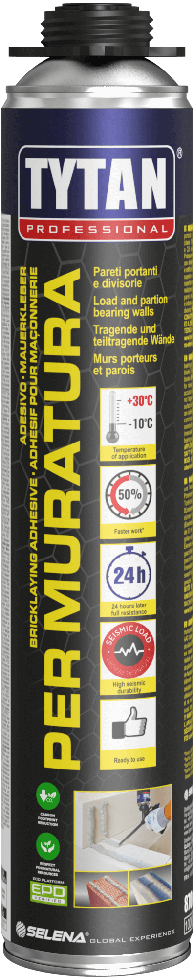 Tytan Professional Schiuma Muratura è un adesivo certificato per la posa di blocchi in laterizio e calcestruzzo aerato rettificati, per ogni tipo di edificio, residenziale, commerciale ed industriale. Una volta indurita è resistente e tenace, meglio di un legante cementizio. Non fa spessore. All seasons.