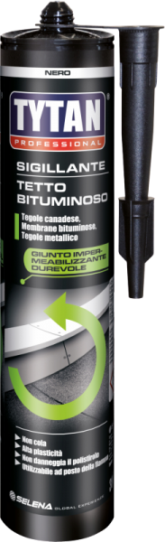 Tytan Professional Sigillante Bituminoso Tetto è un sigillante tixotropico a base di gomma e bitume. Indurisce per asciugatura all’aria, forma un materiale elastoplastico adesivo ed impermeabile, resistente al sole ed alle intemperie. Per giunzione e riparazione di guaine di copertura, per sigillatura di fissaggi o attraversamenti su guaine impermeabilizzanti, scossaline e staffaggi di pannelli solari. Ha un’eccellente adesione a tutti i materiali di copertura: bitume, tegole, alluminio, acciaio, legno, pietra, mattoni, calcestruzzo, lamiere.