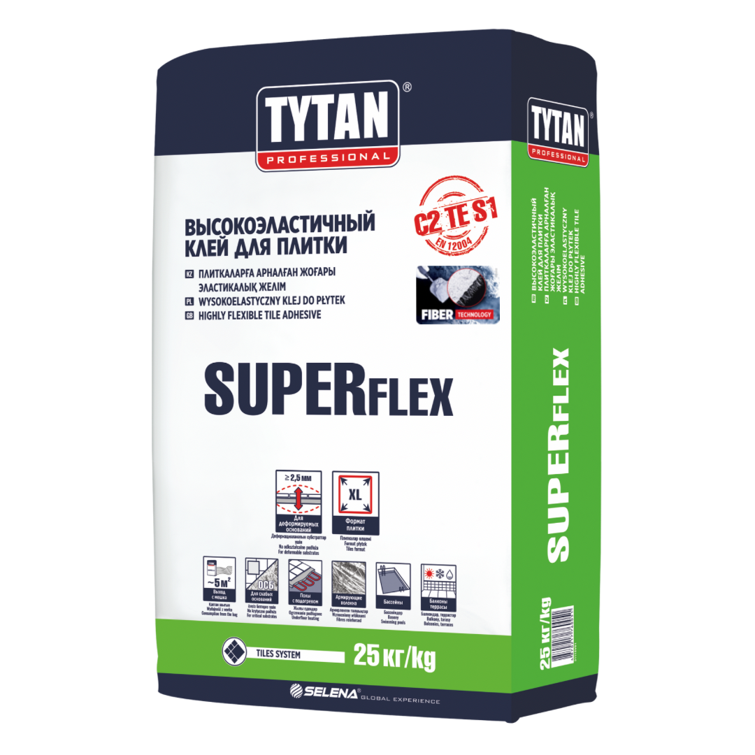 Клей SUPERFLEX S1 предназначен для эффективного приклеивания всех видов настенной и напольной облицовочной плитки: керамической, глазурованной, терракотовой, клинкерной, керамогранита, мозаики, узорчатой, цементной, из натурального (после проверки устойчивости к изменению цвета) и искусственного камня, малых и больших размеров. Предназначен для использования на любых типовых и требовательных основаниях, для наружных и внутренних работ, включая балконы и террасы, полы с подогревом, кухни, ванные комнаты, бассейны, фасады, переходы.