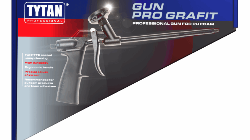 Tytan Professional Pistolet PRO Grafit z teflonową powłoką, łatwy w czyszczeniu i odporny na zabrudzenia. Umożliwia precyzyjną aplikację piany w wąskich szczelinach, idealny do montażu ram okiennych i drzwiowych. Kompatybilny z dowolną pianą lub pianoklejem Tytan Professional.