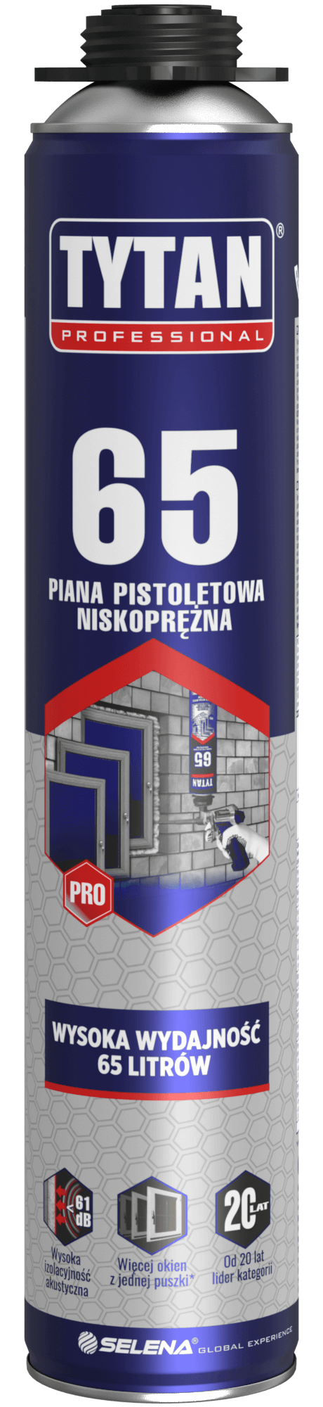 Tytan Professional 65 to wysokowydajna i niskoprężna piana pistoletowa, która jest doskonałym rozwiązaniem w instalacji stolarki otworowej oraz w pozostałych wymagających pracach budowlanych. Dzięki wysokiej wydajności produktu z jednej puszki można zainstalować więcej okien niż przy użyciu piany o standardowej wydajności.