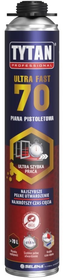 Piana pistoletowa Tytan Professional ULTRA FAST 70 charakteryzuje się wysoką wydajnością do 77 litrów oraz niską post-ekspansją. Nowoczesna formuła umożliwia wstępną obróbkę po niecałych 20 minutach. Po 1,5 godzinie pełne utwardzenie piany pozwala przejść do kolejnych etapów montażowych. Jednolita struktura zapewnia bardzo wysoką izolacyjność akustyczną do 63 dB i termiczną. Piana jest odporna na pleśnie i grzyby oraz na działanie wysokich i niskich temperatur.