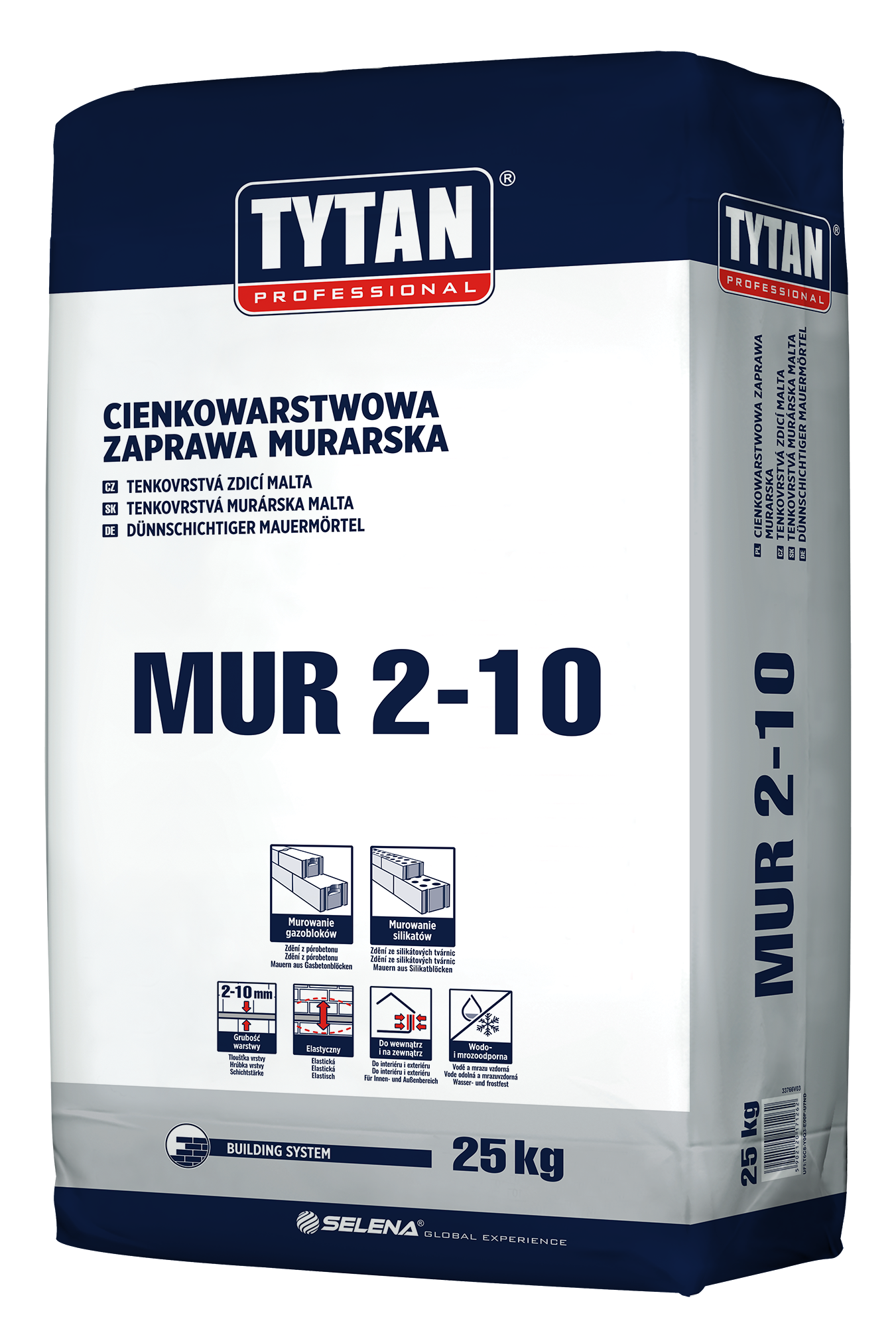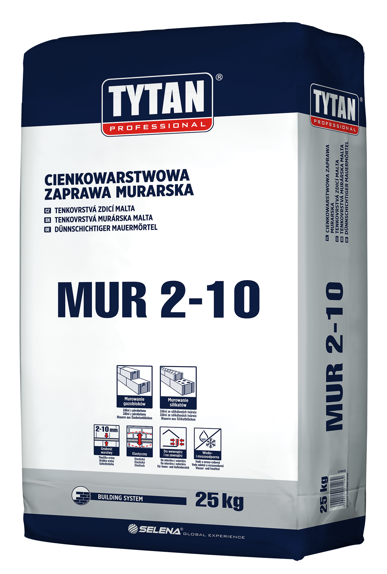 Cienkowarstwowa zaprawa murarska MUR 2-10 charakteryzuje się bardzo dobrą urabialnością, łatwą aplikacją oraz wysoką przyczepnością do elementów murowanych. Zaprawa przeznaczona jest do murowania zewnętrznych i wewnętrznych ścian z bloczków z betonu komórkowego (gazobetonu), wapienno-piaskowych (silikatowych) oraz ceramicznych na cienką spoinę (2-10 mm). Znajduje zastosowanie w budownictwie mieszkaniowym i przemysłowym.