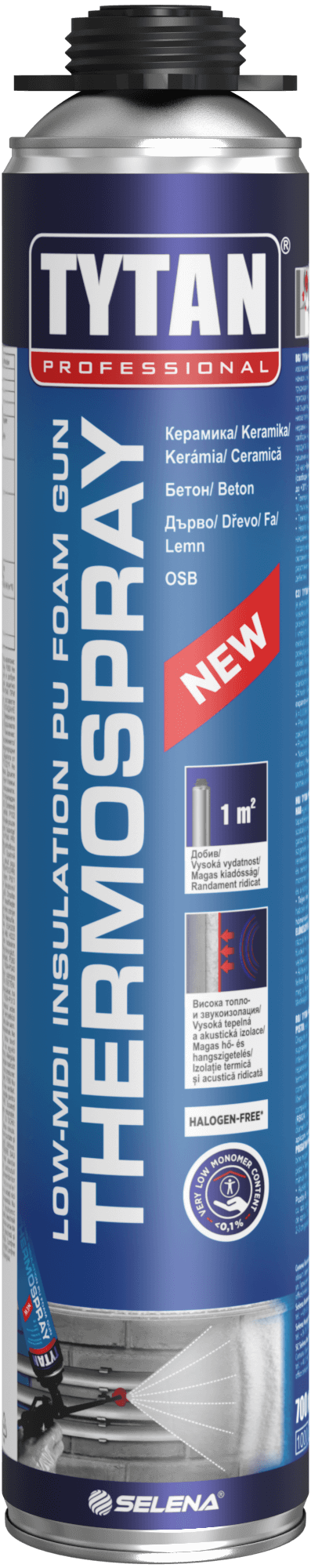 Thermospray LOW-MDI este o spumă poliuretanică modernă, monocomponentă, pentru aplicare manuală, concepută pentru asigurarea unei izolații termice și fonice rapide și eficiente a compartimentărilor interioare și exterioare ale clădirilor, inclusiv în zone greu accesibile și cu forme neregulate.