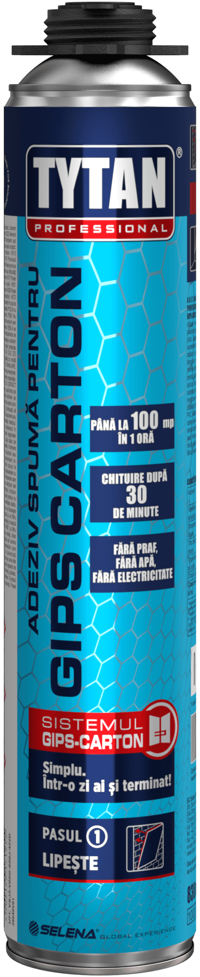 Adeziv poliuretanic profesional monocomponent dedicat fixării gips-cartonului, fibrocimentului, cimentului și plăcilor pe bază de lemn (OSB) pe substraturi din beton obișnuit, beton celular, cărămidă ceramică, blocuri de silicat, plăci pe bază de lemn. Tehnologia unică permite o aplicare precisă și controlată – oferă posibilitatea de a poziționa și corecta poziționarea plăcii prin apăsare ușoară pe suprafețe cu neregularități de până la 20 mm. Utilizarea adezivului spumă pentru gips-carton vă permite să instalați până la 100 m² gips-carton într-o oră.