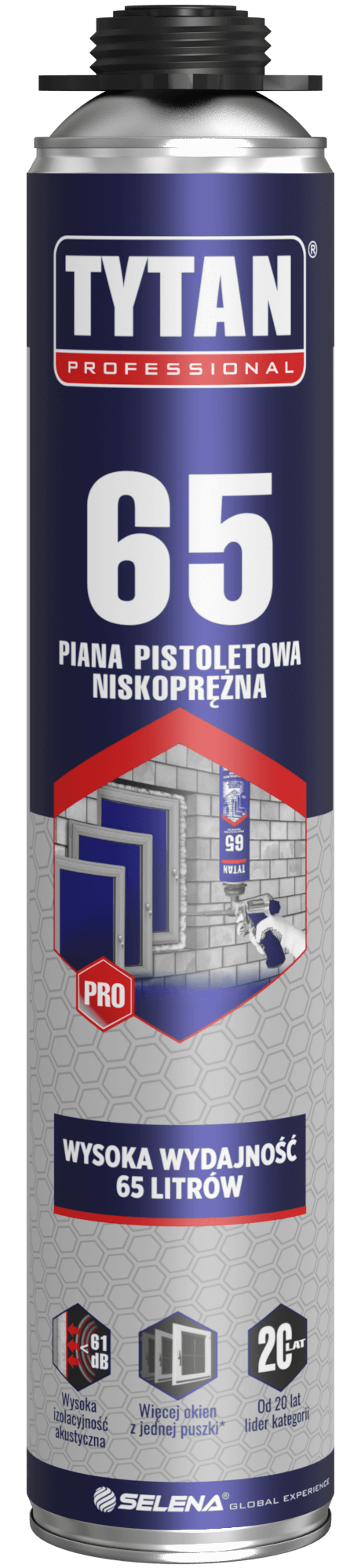 Tytan Professional 65 pena za pištolj stvrdnjava se pod uticajem vlage i preporučuje se za širok spektar građevinskih primena, kao što su: montaža, zaptivanje, popunjavanje i izolacija. Zahvaljujući modernoj formuli i povećanom početnom širenju, moguće je dobiti do 40% više pene.