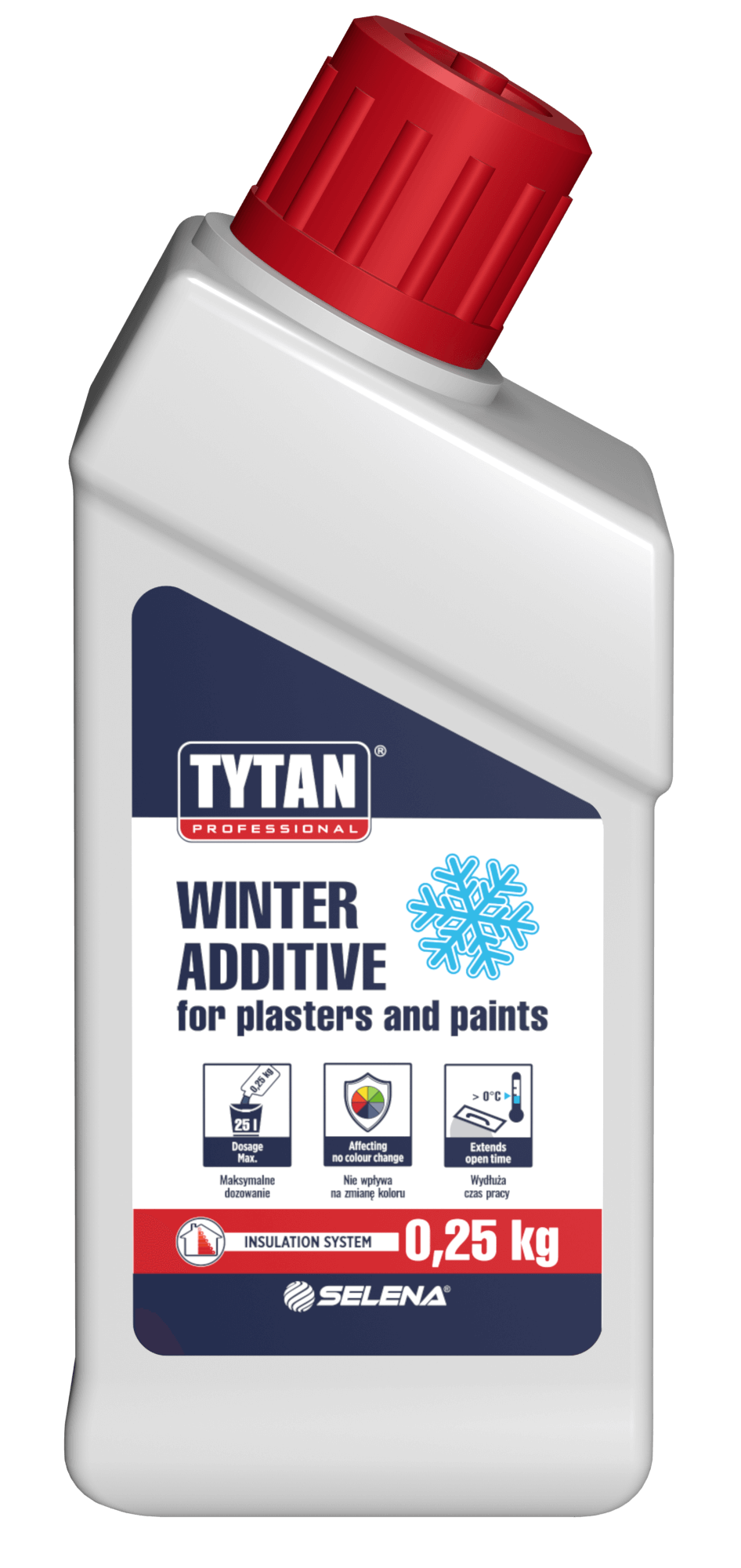 Zimná prísada do omietok a farieb umožňuje zatepľovacie práce s použitím fasádnych omietok a farieb v podmienkach nízkych teplôt, t.j. od 0°C do + 10°C a zvýšenej vlhkosti vzduchu do 80%. Je to bezfarebná kvapalina, ktorú možno pridať do akrylátových, koloidných silikátových a silikónových omietok a do fasádnych akrylátových, koloidných silikátových a silikónových farieb. Produkt chráni pred účinkami znížených teplôt, prispieva k rýchlejšiemu spájaniu a vysychaniu spojiva. Pridaním prípravku sa nemení farba omietky alebo farby. Neznižuje pevnosť konečného náteru a umožňuje oveľa rýchlejšie dosiahnuť odolnosť voči nepriaznivým poveternostným podmienkam. Rýchlosť jeho prevádzky závisí od teploty a vlhkosti prostredia.