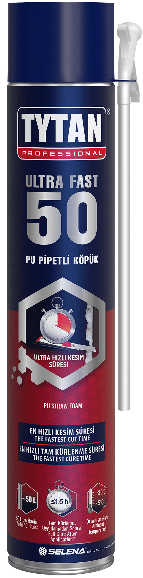Tytan Professional Ultra Fast 50 yeni nesil, hızlı kürlenen PU köpük. Eşsiz yeni formülü sayesinde 10-20 dakika sonra köpük kesilir ve uygulamadan itibaren 1.5 saat sonra tam kürlenme gerçekleşir.