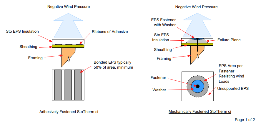 There is also a broader installation argument for adhesive fastening. One popular EIFS system advises adhesive fastening versus traditional fasteners. They say adhesive fastening provides a more uniform attachment and can maximize wind-load resistance of the wall cladding, while mechanical attachment concentrates loads around individual fasteners. They also note that overdriven mechanical fasteners can break EPS and reduce wind-load resistance.
