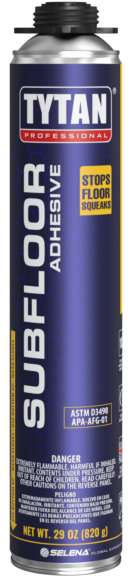Designed to stop annoying floor squeaks and seal potential points of air leakage, TYTAN Professional Subfloor Pro applies as a foam, then immediately turns into a gel. Over the next 24 hours it re-expands to fill gaps, cracks, and inconsistencies in the lumber, creating a rock-hard bond between the subfloor and joist.
