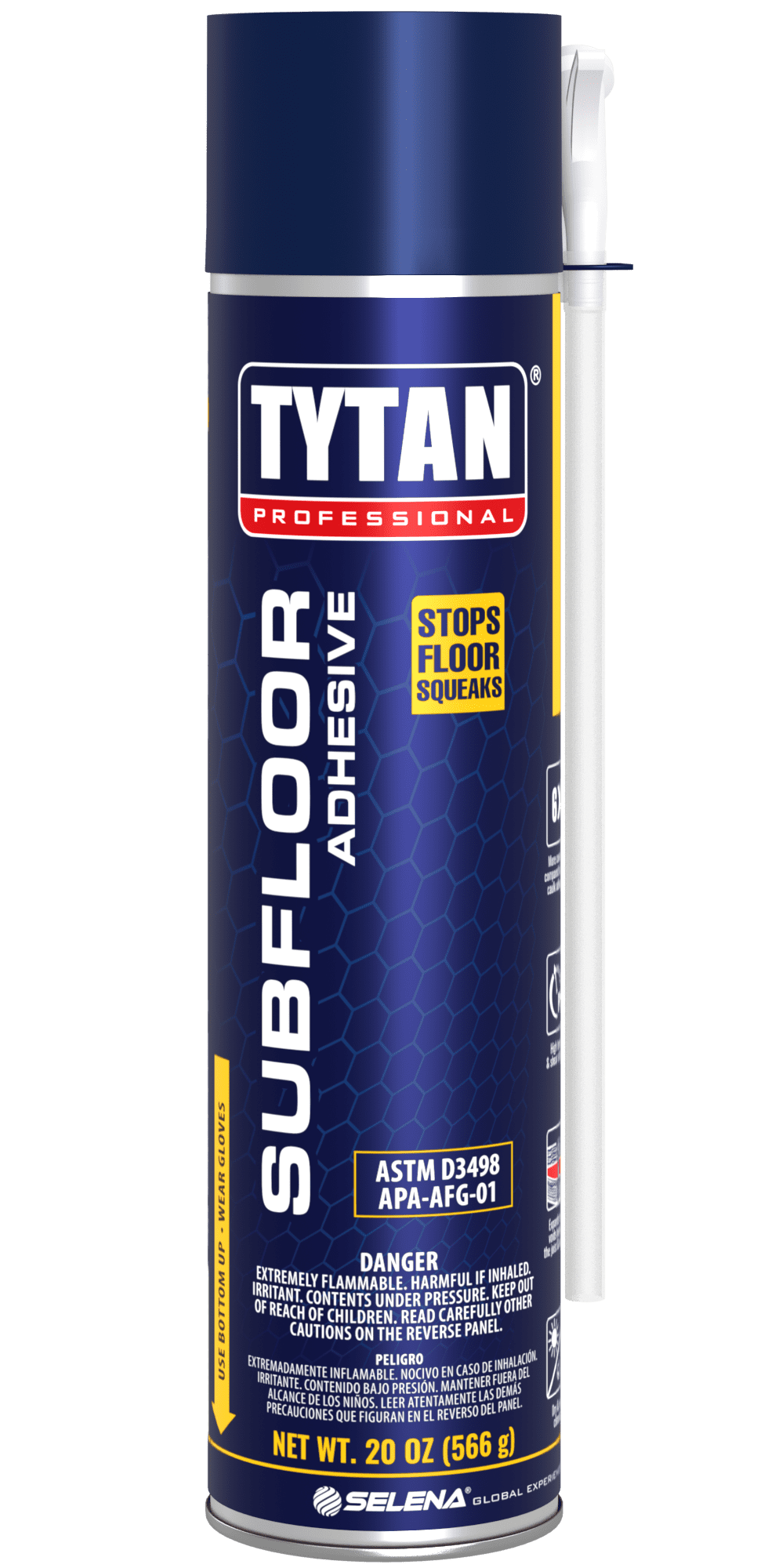 TYTAN Professional Subfloor Adhesive prevents floor squeaks by filling gaps between subfloor and joists, reducing strain on mechanical fasteners. Upon application, TYTAN Subfloor Adhesive immediately reduces to a gel, then slowly expands over 48 hours to fill the voids and provide a strong, squeak-free bond to lumber, plywood, joists, trusses, decking, concrete, metals, masonry and other substrates.