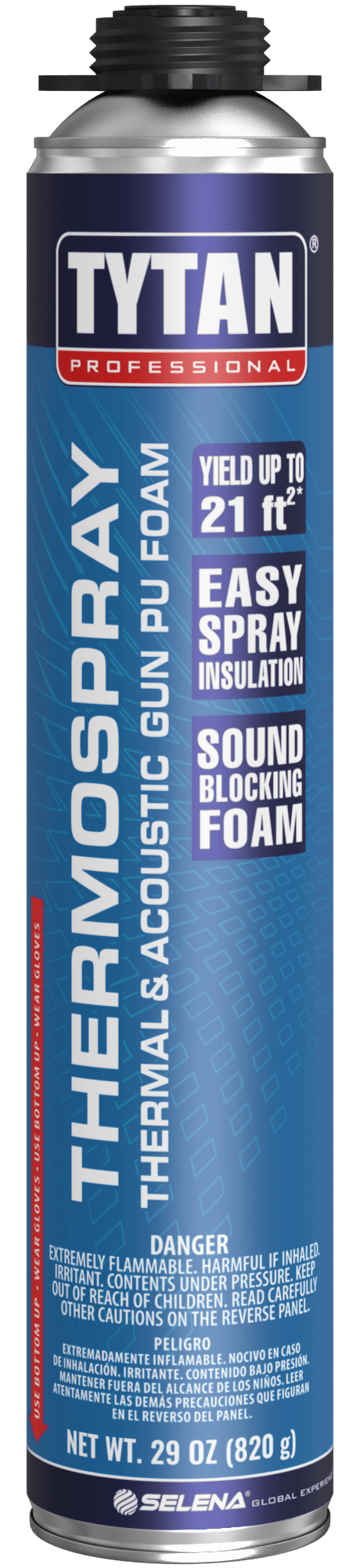 TYTAN® Professional Thermospray Thermal and Acoustic Spray Foam is a heat and sound insulation polyurethane foam designed to work in the toughest conditions. Thermospray is a certified acoustic insulation product. It comes with an easy-to-attach nozzle which allows the foam to fill gaps and voids. It is an innovative alternative to traditional insulaton methods such as polystyrene boards, glass wool, and rock wool. It is a single-component foam designed to be used with a TYTAN Professional applicator gun. For a Job Well Done, use TYTAN Professional Thermospray!